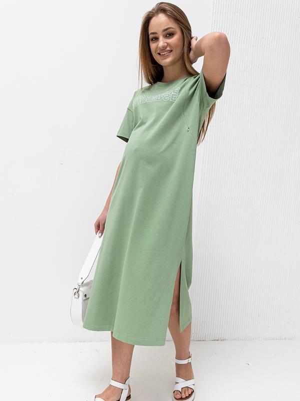 ВІД ЦЬОГО ВИРОБНИКА НАДСИЛАЄМО ТІЛЬКИ НОВОЮ ПОШТОЮ. Базова трикотажна сукня-футболка для вагітних і годуючих мам. Силует: oversize. Секрет годування: потаємні блискавки у нагрудних рельєфах. Оздоблення: напис на грудях. Тканина: тонкий бавовняний трикотаж. Розтяжність тканини: приблизно 10-12%. Колір: зелений. На фотографії: розмір на моделі S, об'єм грудей 90 см, стегон 96 см, зріст 173 см. Розміри: S, M, L, XL Орієнтовні виміри готового виробу: зелений S: Довжина по спинці 118 см, Довжина рукава від горловини 34 см, Груди 108 см, Талія 111,6 см, Стегна 115,4 см. M: Довжина по спинці 119,5 см, Довжина рукава від горловини 35 см, Груди 113 см, Талія 116,4 см, Стегна 120,4 см. L: Довжина по спинці 120,5 см, Довжина рукава від горловини 36,1 см, Груди 118 см, Талія 121,4 см, Стегна 125,4 см. ХL: Довжина по спинці 122,1 см, Довжина рукава від горловини 37,2 см, Груди 123 см, Талія 126,4 см, Стегна 130,4 см. Усадка виробу після прання за об'ємом – 5 см. Склад: 95% Cotton, 5% Elastane.