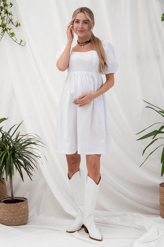 Літня сукня для вагітних і годуючих з жатої бавовни з відкритою спинкою. Силует: обтислий ліф, спідниця - дзвіночок і об'ємні рукави. Стиль: ошатні. Секрет годування: потаємні блискавки в нагрудних рельєфах. Тканина: жата бавовна з текстурою під льон. Розтяжність тканини: тканина не тягнеться 0 %. Колір: білий. На фотографії: розмір на моделі S, об'єм грудей 90 см, стегон 96 см, зріст 175 см. Орієнтовні заміри готового виробу: S: Довжина по спинці (від 7-го шийного хребця) 90 см. Довжина рукава 32,5 см. Груди 85 см, Талія 136 см, Стегна 150 см. M: Довжина по спинці (від 7-го шийного хребця) 90,5 см. Довжина рукава 32,7 см. Груди 90 см, Талія 146 см, Стегна 160 см. L: Довжина по спинці (від 7-го шийного хребця) 91 см. Довжина рукава 32,9 см. Груди 95 см, Талія 153 см, Стегна 167 см. ХL: Довжина по спинці (від 7-го шийного хребця) 91,5 см. Довжина рукава 33,2 см. Груди 101 см, Талія 160 см, Стегна 175 см. Усадка виробу після першого прання в довжину - 1,5 - 2 см. Усадка виробу після першого прання по ширині - 1 - 2 см. Состав: 100% Cotton.