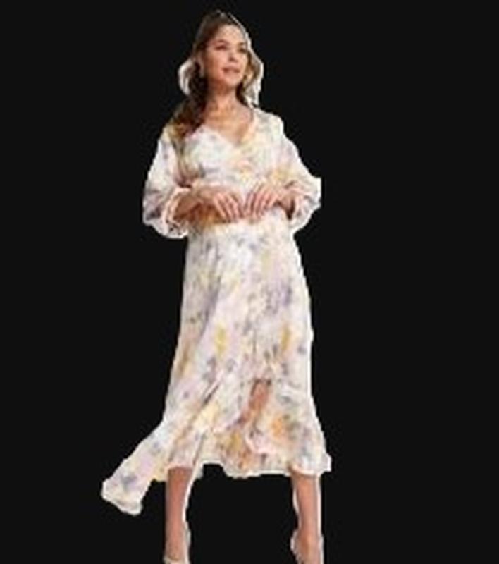 Жіноча довга сукня на запах, для вагітних святкове плаття халат об'ємний рукав. Бренд, склад та колір на фото В одному розмірі 16,evro 46 Виміри: плечі 42 см, ширина горловини 22 см, плеча 10 см напівобхват: груди 58 см, талія 49-61 см - по спині гумка, стегна 60-68 см, низ вільно, Довжина від плеча 126 см, у т.ч. спідниця 88 см, а волан 22 см довжина рукава від плеча 47-48 см, напівобхват біцепса-23 см, манжета 15 см спереду та від пояса біла еластична підкладка довжиною 45 см. без кишень, верх не тягнеться, стан нового.