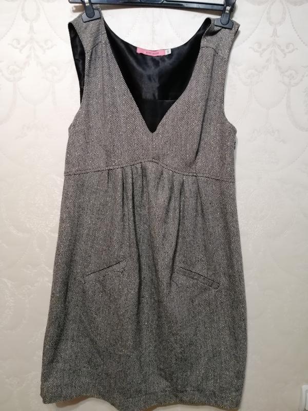 Сукня для вагітної. Тепле, одеваеться під гольф чи сітку. Сірого кольору, шерсть. Присутній золота нитка, що робить його привабливим. З боку замок. Є кармашики, але вони для краси. Завищена талія. До низу трапеція Заміри: Довжина. 90 см В грудях. 44 см В низу ширина 56 см