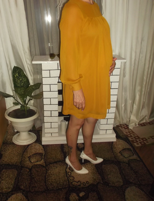 Красивое,лёгкое и очень удобное платье для беременных. Цвет насыщенно горчичный как последнее фото.Одевала очень мало к сестре на свадьбу. Размер М. На подкладочке. Материал жатый шифон. Состояние хорошее,но есть маленький нюанс,зацепка,но при носке её не видно,на последнем фото показала. H&M