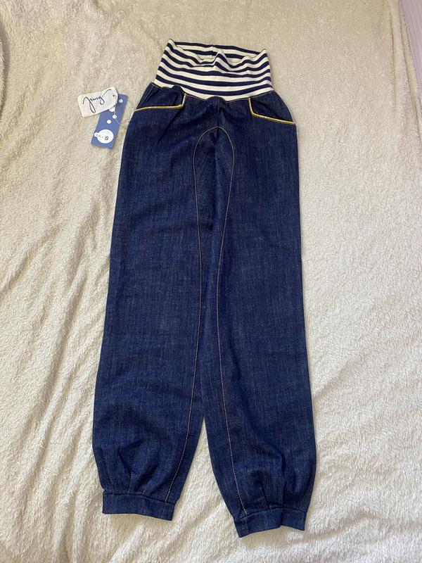Нові штани з високою манжетою для живота, низ штанин на гумках. Джинс не товстий, злегка тягнеться. Заміри на фото. Дивіться й інші свої оголошення.