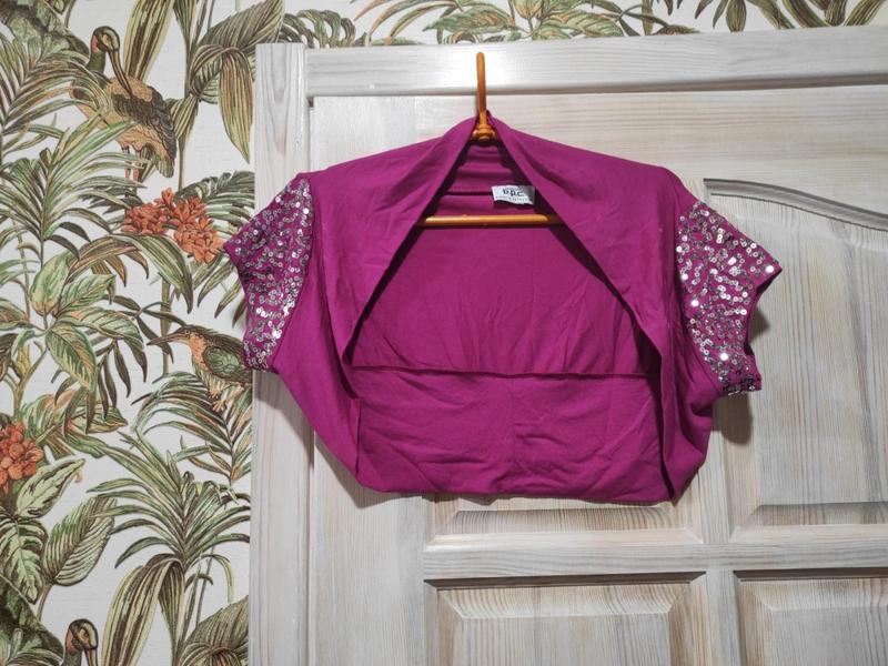 мягкое яркое болеро с пайетками., состояние очень хорошее секонд ткань мягкая, приятная к телу, отлично тянется ( бирочка с размером и составом отсутствует), похоже на вискозу. без застёжек, рукава украшены серебристыми пайетками. хорошо садится от М до XL., лёгкое, на плечах практически не чувствуется, удобное. оттенок может отличаться от фото фото на теле нет.