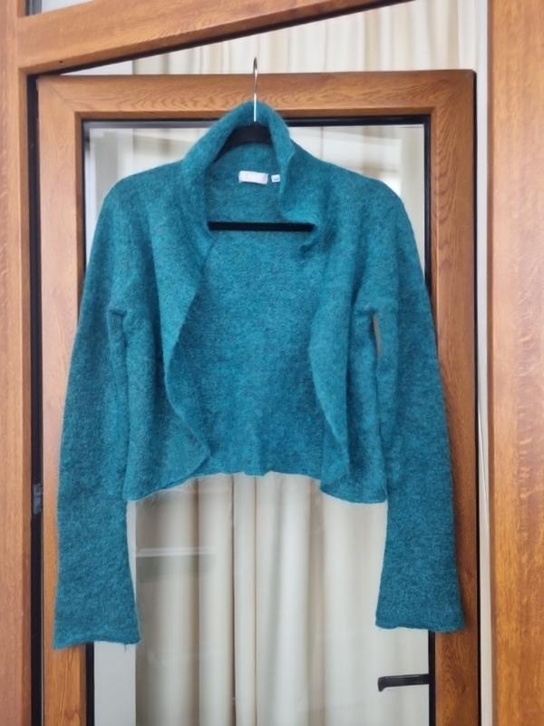 Кофтинка, чудового кольору, на фото трохи яскравіше, ніж у житті, гарно сяде на розмір S, M. Виміри: плечі - 42, довжина рукава - 64, довжина виробу - 46, пог - 44