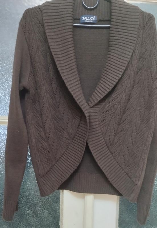 Продам джемпер(болеро) темно коричневого кольору,бренду Saloos, виробництва Британії ,стан ідеальний, розмір М/ 46. Заміри в спокійному стані: Ог- 94 см, довжина рукава від плеча- 62 см, довжина джемпера- від плеча -56 см.
