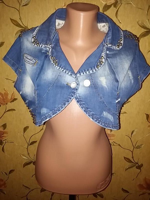Стильна джинсова болеро з заклепками. Застібається на ґудзик. В обсязі грудей регулюється двома гудзиками Довжина по спинці 36 см, ширина плечей 35 см, пог 46-47, по низу ширина 41-44