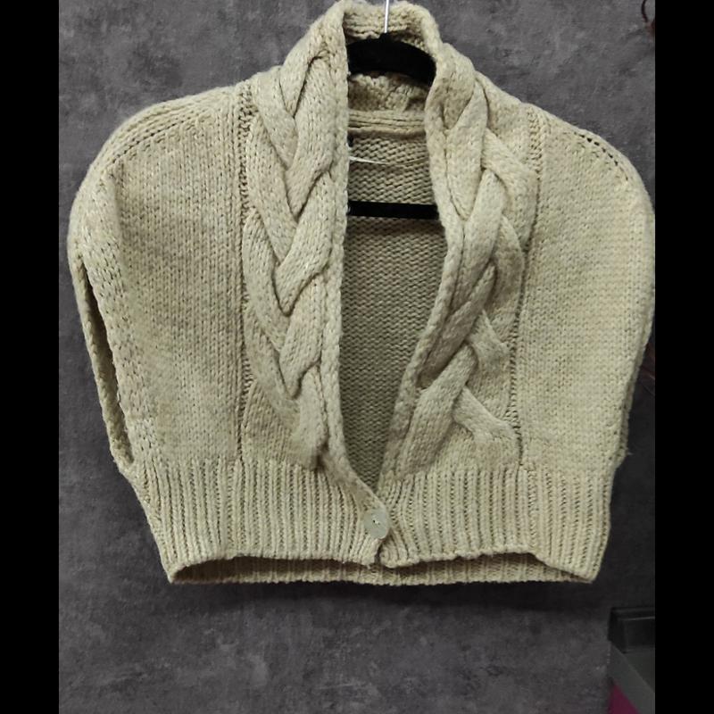 Очень теплая стильная кофтюля бежевого цвета с приспущенными плечами, длина до талии. Состояние новой вещи, крупная пуговица из натурального перламутра, есть запасная пуговка.