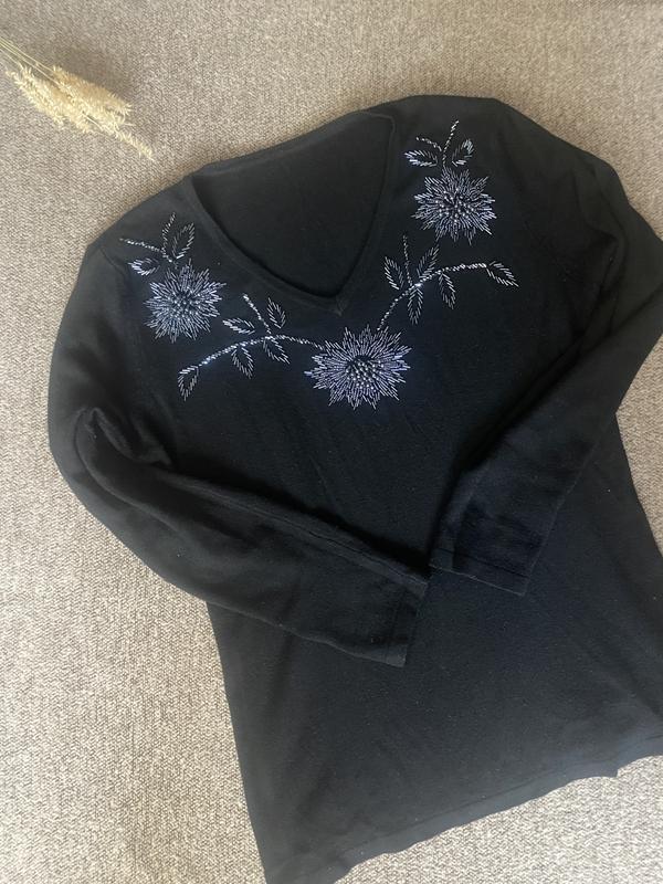 Дуже гарна, нарядна кофта. Мяка, комфортна. Вишита дорогим, гарним бісером, на соці переливається. Довжина 61см рукав 55см+10см на пог від 50см+++ тягнеться добре