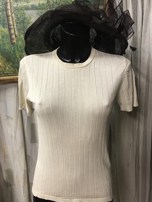 Трикотажный шёлк. Отличный джемпер под горлышко . Состав:шёлк-109/. Размер по бирке -М. Замеры: длина-57 см, ПОГ-40 см, ПОБ-41 см.есть незначительное занрЯзнение по головине-нужно вястирать(см. Последнее фото).