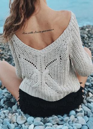 Літня кофта, в'язана, з V-подібним вирізом на спині / або декольте, якщо одягнути вперед. Плетіння машинне, нитка щільна, але легка, на льотний вечір супер!