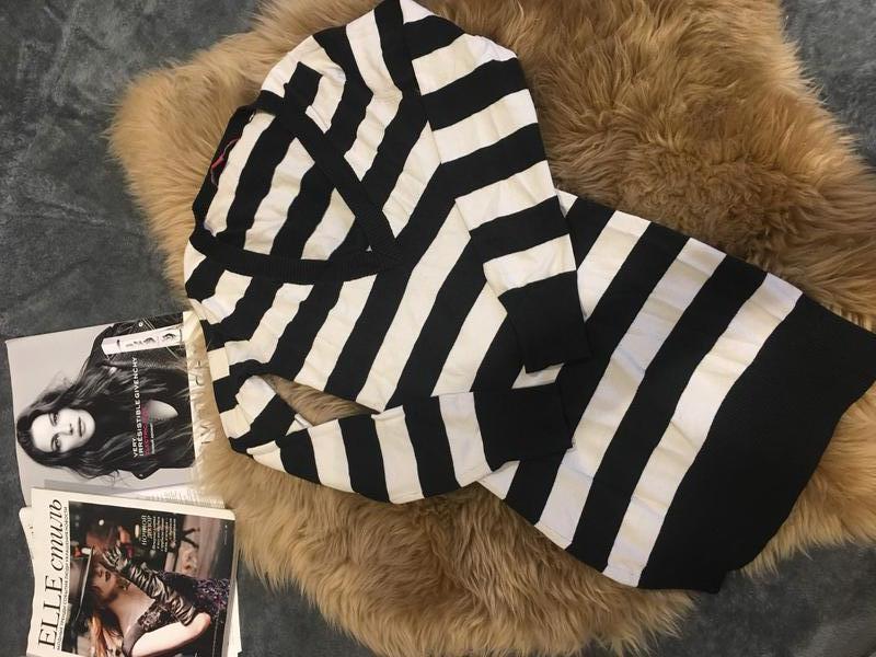 Фото На тілі немає) На моделях, наприклад,) Довжина 67 см) Плечи 30 см) Рукав 53,5 см) Пог 33,5 см) тягуча, рукави довгі, викот v-подібний, на рукавах манжети в рубчик, приталена) унизу манжета середньої ширини в рубчик) Підійде на розмір із м європейський орієнтуйтеся за замірами) Продається позаяк є без повернення й без притензій) Одяг у смужку знову на гребені модної хвилі. Дізнайся, як правильно її поєднувати. У цьому сезоні різнокаліберна смужка в одязі буде у великій моді. Найчастіше, смужку приписують до чисто морської круїзної тематики, але це далеко не так. Сьогодні модно носити саме різноманітну смужку: горизонтальну та вертикальну, монохромну та діагональну, дрібну та середню, чорно-білу та кольорову. Як ми бачимо, модна смужка може бути абсолютно різноманітною. Тут головним чинником — чи подобається вона тобі, а також підходить вона до твоєї фігури