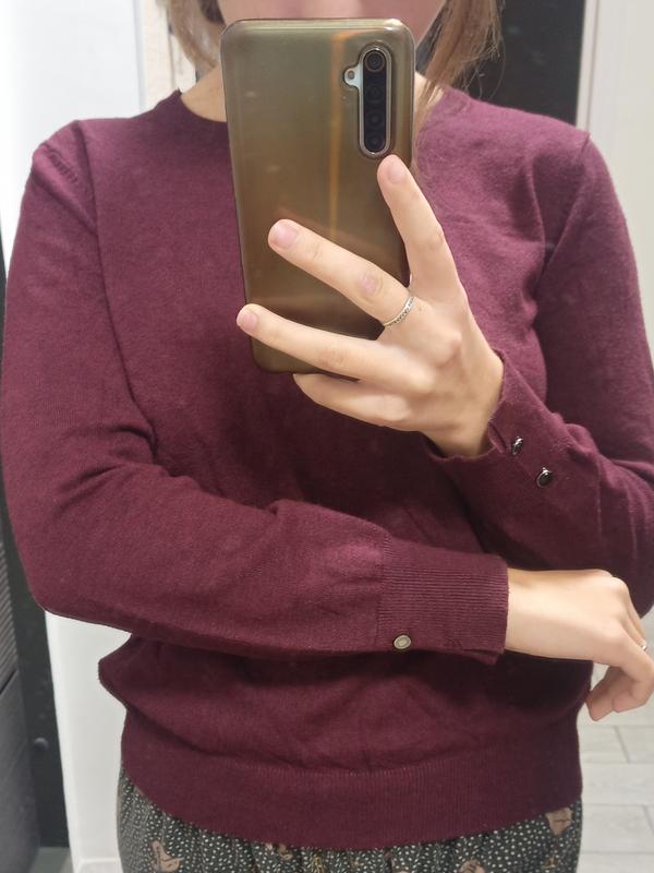 Кофта бардового кольору, немає однієї пуговки на рукаві , розмір М по бірці , але більше на S . Трохи катишок є .