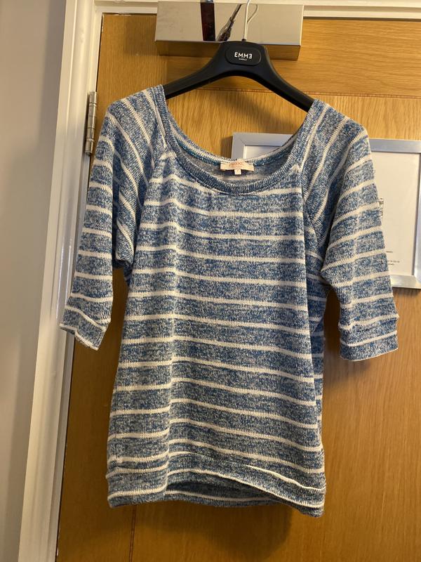 Кофта, гарний крой, високої якості. В полоску, рукав 3/4. Розмір s/m Довжина 60 см, ззаду 63 см Ширина 52 см Рукав від горловини 42 см.