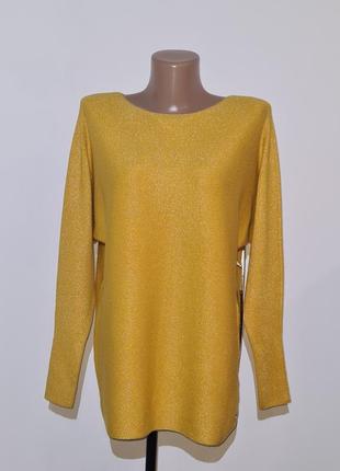 Очень красивый, нарядный джемпер с люрексом желтого цвета. Рукав "летучая мышь". Размер L-XL (полномерный) объем по груди 108 см, объём по низу 100 см, плечо+рукав 66 см, длина по спине 63 см. Состав: 50% вискоза, 40% модал, 10% нейлон.