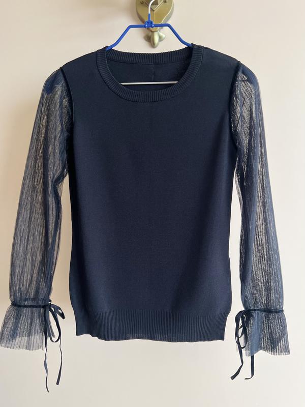 Стан нової. За рахунок цікавих рукавів виглядає дуже елегантно, рукава зав'язуються оксамитовою стрічкою. Довжина 61 см., довжина рукава 62 см., напівобхват грудей 42 см., напівобхват талії 41 см. Тканина зі стрейчем. Насичений чорний колір, фото не передає.