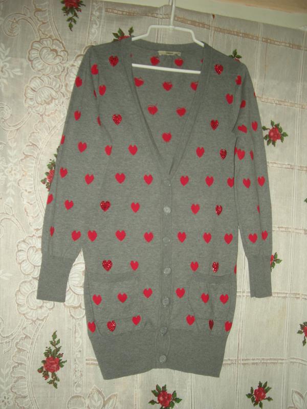 Шикарная кофта серого цвета,фирменная,натуральная,с красного цвета сердечками по всему полю,некоторые из них впереди с блестящими камушками,сердечки не нашиты,а из той-же ткани,что и кофта,застегивается впереди на пуговицы,два кармана впереди,низ рукавов и низ кофты-широкая манжет-резинка,объем груди-94см.,длина рукава-61см.,длина кофты-82см.