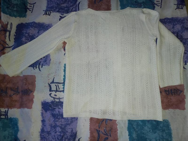 Ніжний ажурний джемпер кольору айвори з рукавом три чверті. ПО груди 40 см, довжина по спинці 49 см, ширина по плечам 35 см, довжина рукава від плечового шва 40 см.