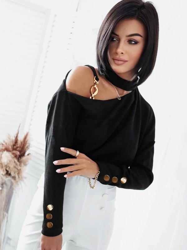 В наявності💔 Кофта oversize Мод: 462 Розмір: універсал 42-46 Тканина: ангора (дуже приємна до тіла) Колір: чорний Плече докоровано прикрасою, на рукавах золоті ґудзики 💸Ціна: 590 грн Гарна якість.