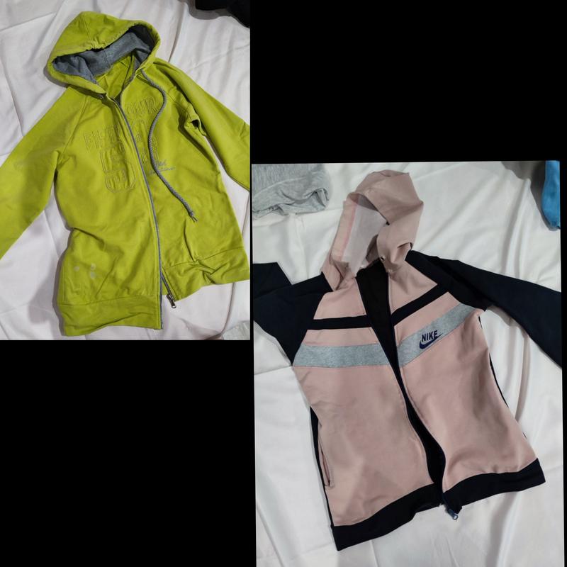 Дві кофти на блискавці та з капюшоном 1. Зеленого кольору, з дефектом, але якість дуже приємна на дотик, тканина 100% щільний котон. Виробник: Італія. 2. Рожева, без дефектів, в хорошому стані. Тканина: 2-охнитка.