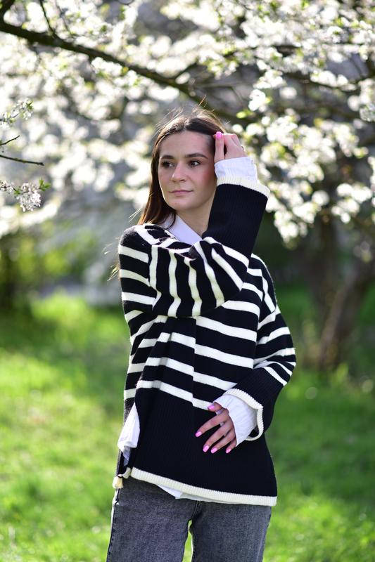 Джемпер чорного кольору в горизонтальну смужку. Вільного крою з розрізами з боків. Розмір Універсал xs-m