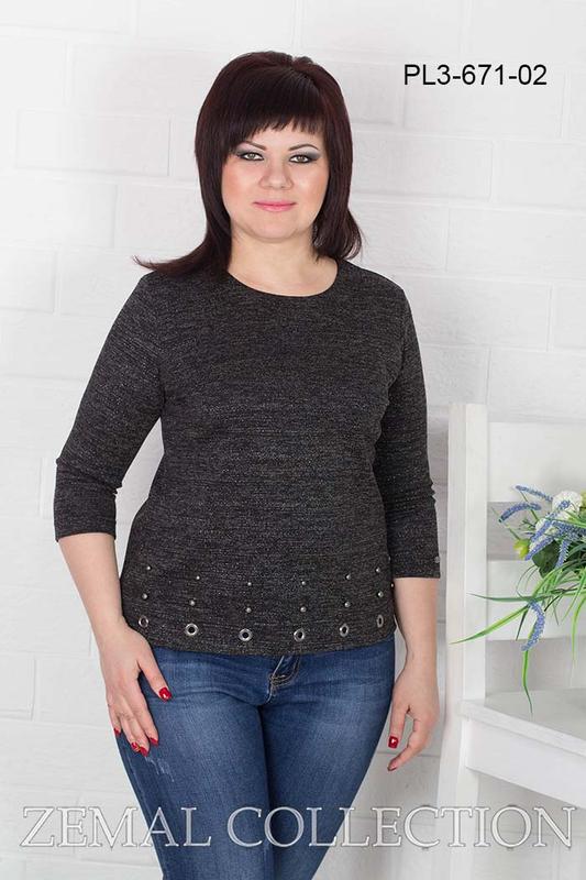Матеріал: ангора софт люрекс Джемпер із трикотажу з довгим рукавом, круглою горловиною. Горловина, рукави та низ розпошують. По низу переду встановлений ряд люверсів і 2 ряди оздоблювальних перлин