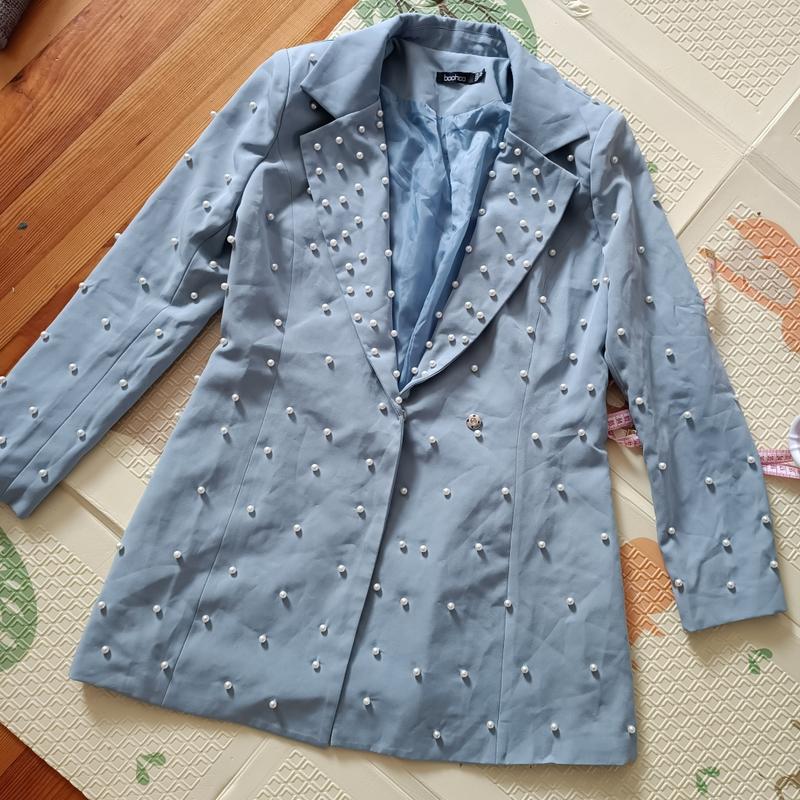 стан нового, є невеличка як нитка підтягнута на останньому фото, це якщо дуже придивитись а життя видно не буде. є дві пуговки мені впритик на 50 розмір, можна щастібати на другу і буде більш ширше. колір ніжно блакитний