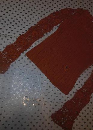 Очень оригинальный свитерок с вязанными рукавами Насыщенный рыжий цвет б\у с распродаж состояние хорошее дефектов нет рр 42-46 отлично тянется смотрите по замерах указано длина-50-55см п\о\г-36(54см) п\о\т-34(54см) п\о\б-36(56см) рукав-75см