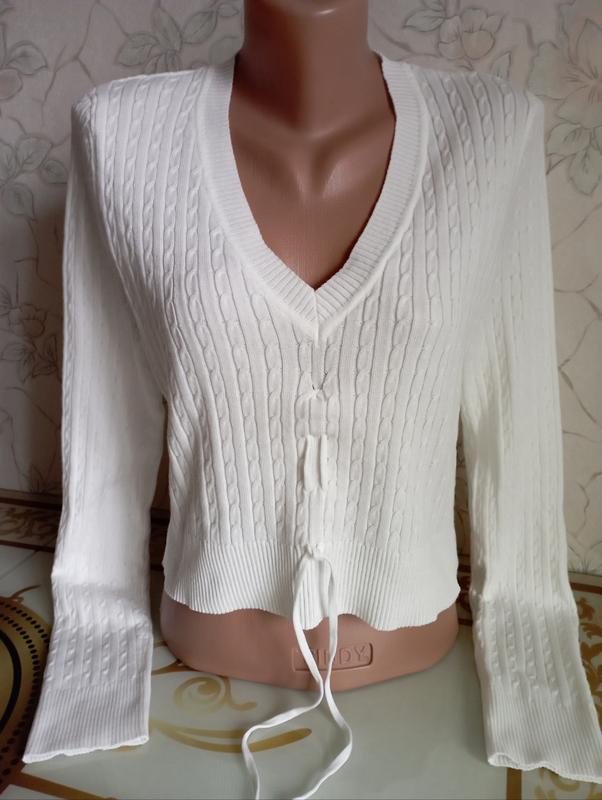 Актуальний, фірмовий трикотажний кроп топ з довгими рукавами , плечі 36 , ПІГ 47-50 , ПІТ 41 , тканина добре тягнеться , рукав 66 , довжина виробу 45 . Стан нової речі .