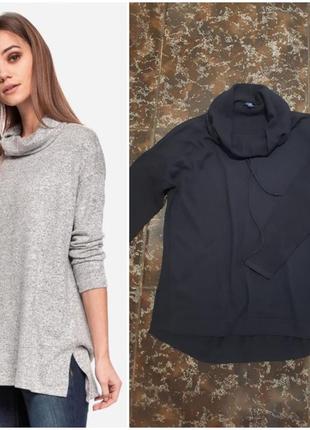 Джемпер от немецкого бренда. Цвет темно-синий, камера не перепала. Длина свитера асимметричная, из вискозного трикотажа, высокий воротник, спущенная линия плечевого шва, снизу с обеих сторон разрезы. Логотип бренда, расположенный внизу, подтверждает оригинал изделия. Состояние нового, только без броков. Замеры: ПОГ 55, длина 58/67. Подойдет на 46 размер (см. фото правый)