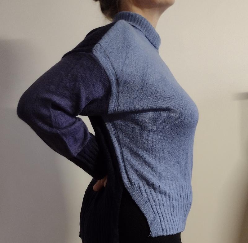 джемпер с интересной цветовой гаммой, свободного кроя, полотнище спинки удлиненное замеры: полуобхват груди 60 см, полуобхват бедер 58 см длина спереди 63 см длина сзади 72 см длина изделия от горловины до запястья 70 см