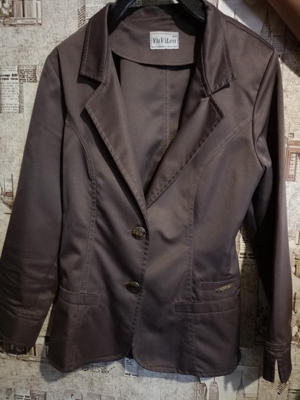 Пиджак женский, размер 42-44 Полу обхват груди - 40 см Полу обхват талии - 36 см Длина - 56 см Длина рукава от плеча - 50 см В хорошем состоянии.