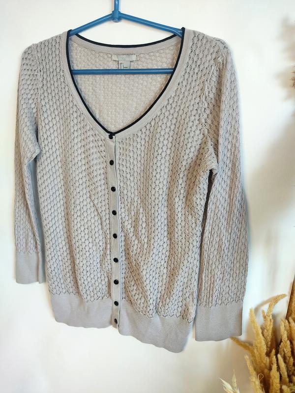 Кофтинка на гудзиках, джемпер H&M в класичному стилі. Ажурна в'язка, натуральна тканина, рукав 3/4. Без дефектів і слідів використання плечі 37 довжина 62 ширина 45 рукав від плеча 53 Тягнеться