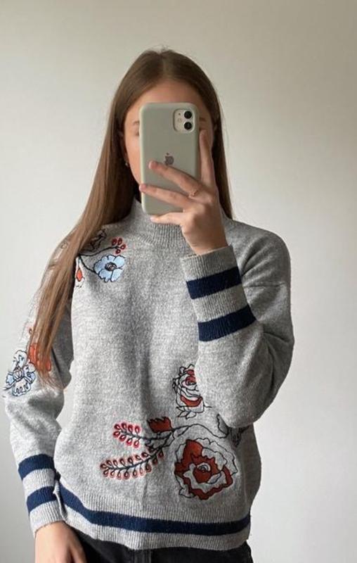 Джемпер Tu з вишивкою розмір 10 сірий 74 акрил 23 поліестер 3 еластан пог-53 довжина-62 рукав-50.Дуже приємний до тіла.Підійде для M та L .