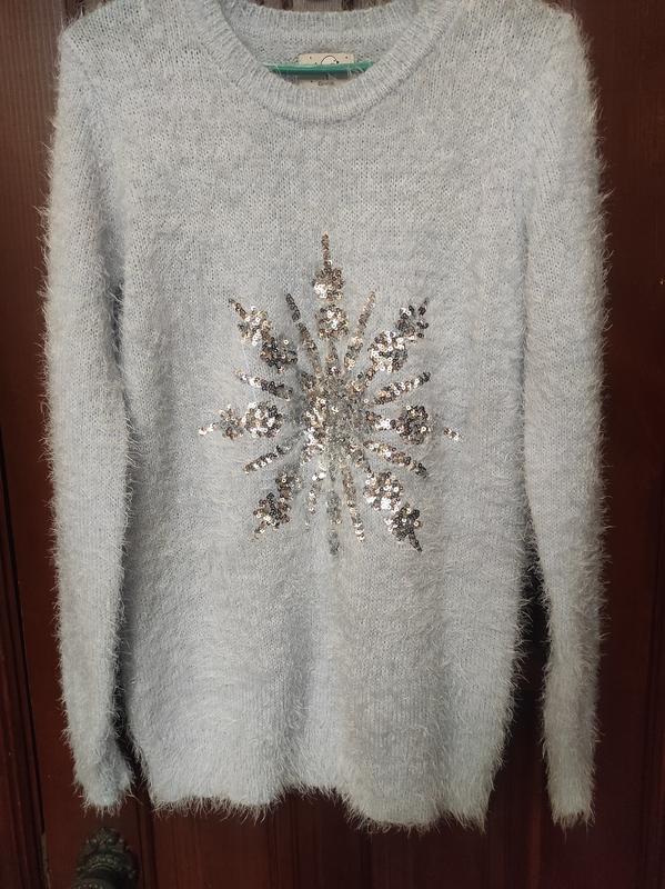 Джемпер-травка. Очень мягкий, очень приятный, не тонкий. На новогодние праздники. Снежинка в пайетках. Б/у в очень красивом состоянии. Очень нежный и праздничный джемпер ЗАМІРИ: ПОГ 41 ПОБ 41 ДОВЖИНА 70