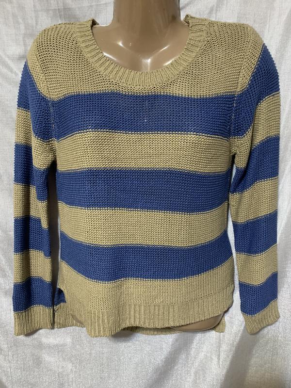 Джемпер класичного фасону виворітного нещільної в'язки. Заміри: довжина - 56/63см., плечі - 39см., рукав - 57см., ПОГ - 45см., ПОТ - 43см., ПОБ - 42см. Є нюанс - на спині дві ділянки, де нитка трохи тонше, фото 3, 5.