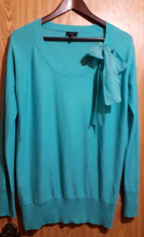 шикарный джемпер бирюзового цвета от знаменитого бренда escada ,отличный состав ткани:шерсть мериноса+шелковый сатин,рукав реглан,с левой стороны красивый бант (хлопок+шелк) ткань легкая и тонкая,вещь личная(не сток и не секонд)куплен в Германии,надет единственный раз,состояние нового,размер XL пог 53 длина рукава от горловины 75 длина 74 оплата на карту приват или наложеный платеж по предоплате на доставку