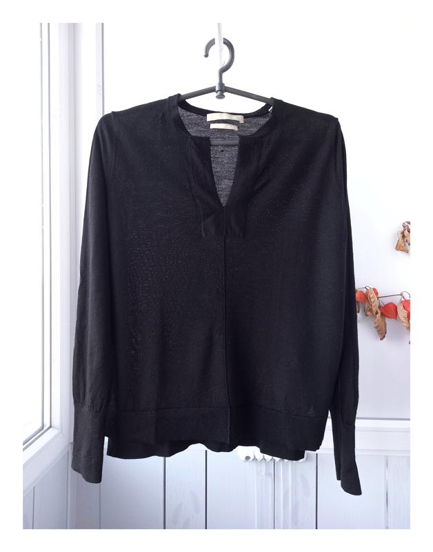 Заміри: нОг - 47 см довжина - 58/54 см рукав від плеча - 60 см Склад тканини: 100% екстратонка вовна мериноса Джемпер з фігурною горловиною, по боках розрізи (фото 2) Спинка довша на 4 см Спереду декоративна вертикальна смужка Бірка з розміром відсутня, орієнтовно S Стан відмінний, без жодних нюансів