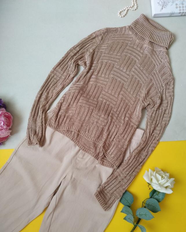 Шикарный джемпер геометрической вязки с воротником под горло, хорошо тянется, производство Франция Стан идеален, без нюансов Размер S Длина 50-55см( сзади длиннее) Полуобхват груди 43см-48(тянется) Плечи 38см Рукав 60см