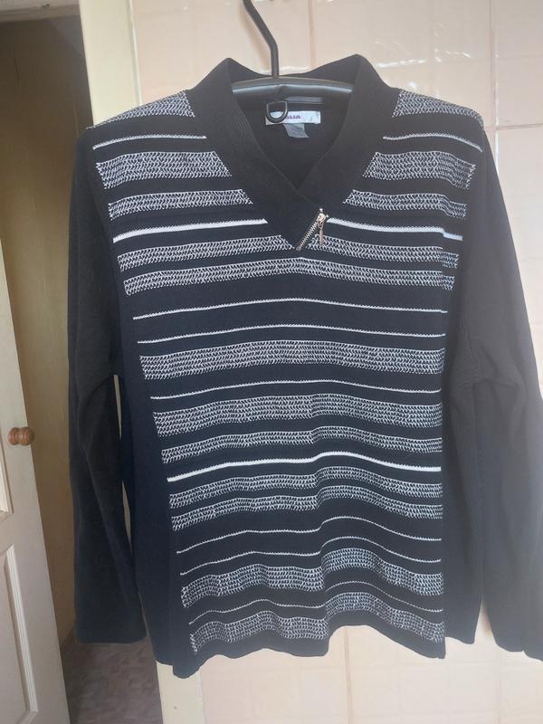 Стильный джемпер, на бирке указан размер XL (50), но больше подойдет на размер 52 и 54. Отличный состав ткани, в идеальном состоянии, за счёт узора скрывает недостатки, спинка чисто чёрная. Красиво оформлена горловина.