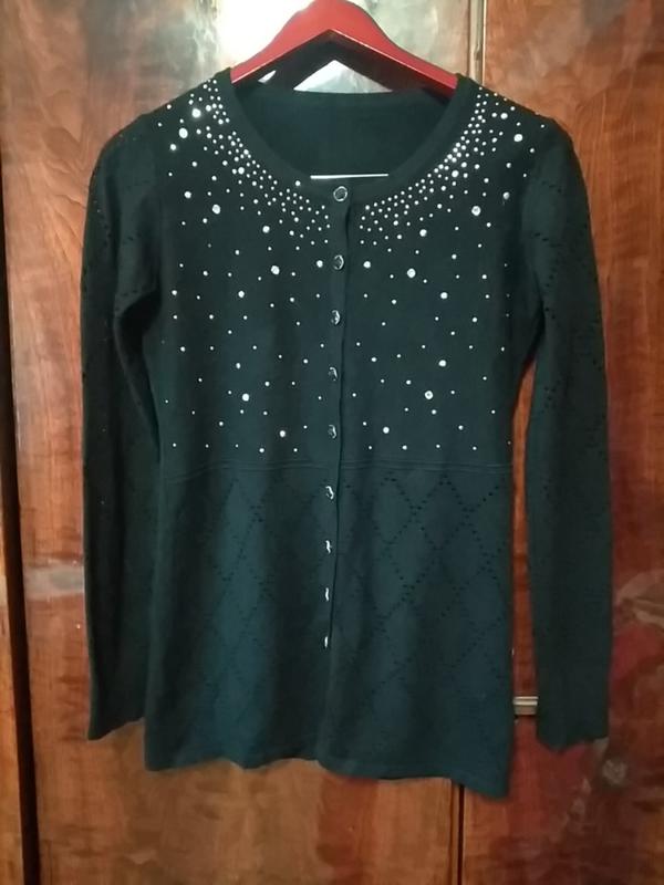 яскрава кофтина зі стразами, м'яка, красива, ПОГ 43, ПОТ 40, довжина 68, довжина рукава 63, відсутні дві пуговки внизу, але це не замітно