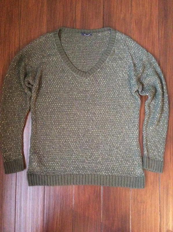 Отличный джемпер травяного цвета с люрексом Плечи-57, рукав-55, обхват груди-114, длина от плеча-67