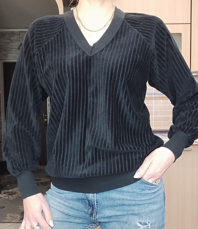 Джемпер велюр в рубчик р. S-M , стан відмінний, колір насичений чорний, камера засвічує довжина 64 ширина під руками 50 рукав від горловини 66