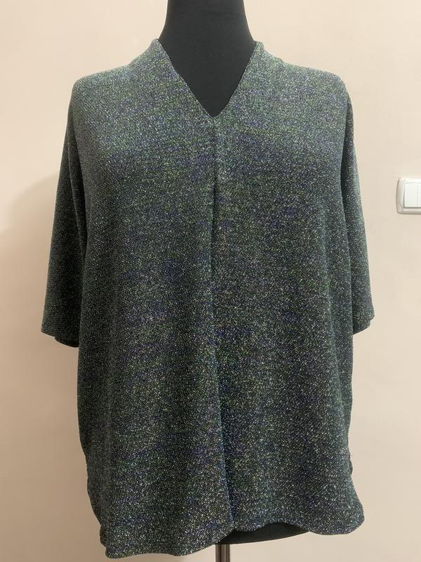 Жіноча еластична люриксова кофта,тканина відмінної якості(люрикс не колеться ),гарний фасон,темно-зеленого кольору,великий розмір,заміри надаю ОГ та ОБ-136 довжина-70 довжина рукава від горловини-52