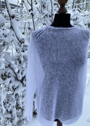 Неймовірний, повітряний светр-павутинка пов'язаний спицями, за рахунок чого полотно виходить нерівномірним, що вносить у виріб особливу "родзинку". Горловина "човником", подовжена лінія реглану, звужений рукав. У цій моделі використаний італійський кідмохер на п/а основі. Товар виготовляється на замовлення