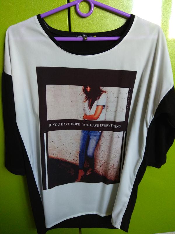 Стильна кофта з комбінованих тканин - спереду щільний шифон, ззаду тканина в дрібний рубчик. Довжина спереду приблизно 66 см, ззаду 69 см, рукав від горловини 47 см (плечовий шов опущений), полуОг 51 див.