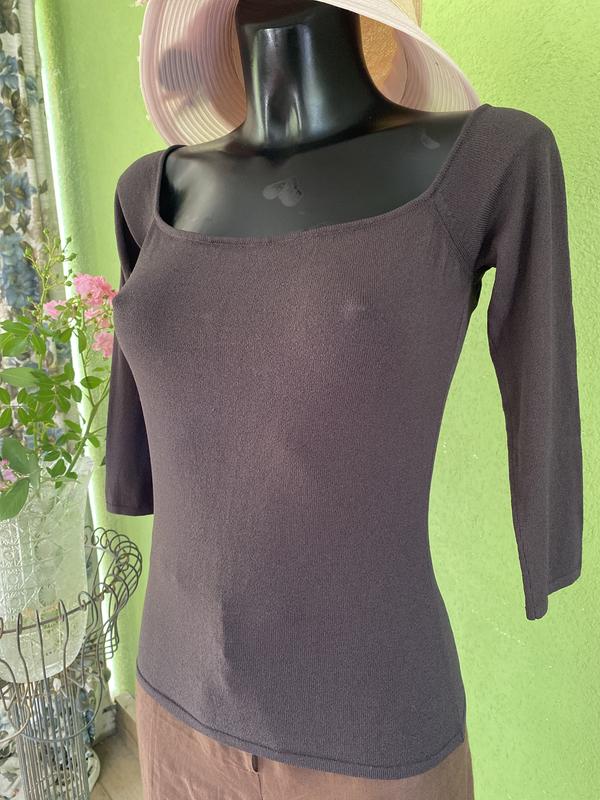 Стильный качественный джемпер коричневого цвета от Sarah -Pacini. Рукав-3/4, отличный вырез -каре. Состав:вискоза/нецлон(68/32). Размер по наборке-one size. Замеры: длина-53, ПОГ-39 см, ПОБ-39 см, рукав-3/4. Хорошо тянется.