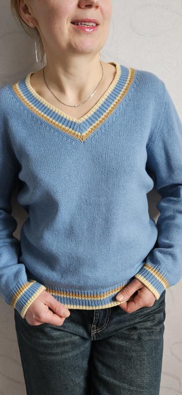 Весняно-осінній джемпер, колір джинс припилений. Полотно приємне на дотик, з невеликим кашеміровим пушком. 25% кашемір, 50%бавовна, 25 % меринос, італійська пряжа Millifili. Поєднала з світло-жовтими і карамельними полосами, які по яскравості чудово доповнюють один одного. Заміри: ширина 49, довжина 55,5 см, рукав 60 см. Машинна в´язка, зшито вручну