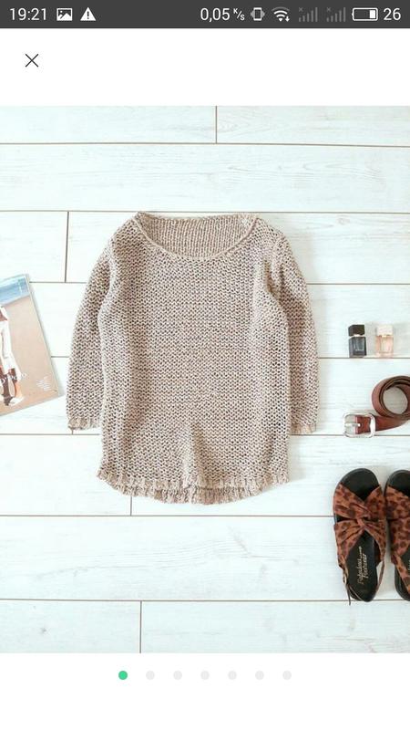 Мегастильний джемпер середньої щільності кольчужного в'язання в красивому кольорі моко, з легкою сріблястою ниткою. Не глибокий виріз, рукав тричертверті, прямої силуету, трохи подовжена. Гарно поєднуватиметься під сорочку з жовтим низом, джинсами. Добре тягнеться. Заміри: Ширина плечей — 40 см Ширина в грудях — 104 см Ширина по низу-102 см Довжина рукава — 43 см Довжина по спинці від плечового шва-63-65 см