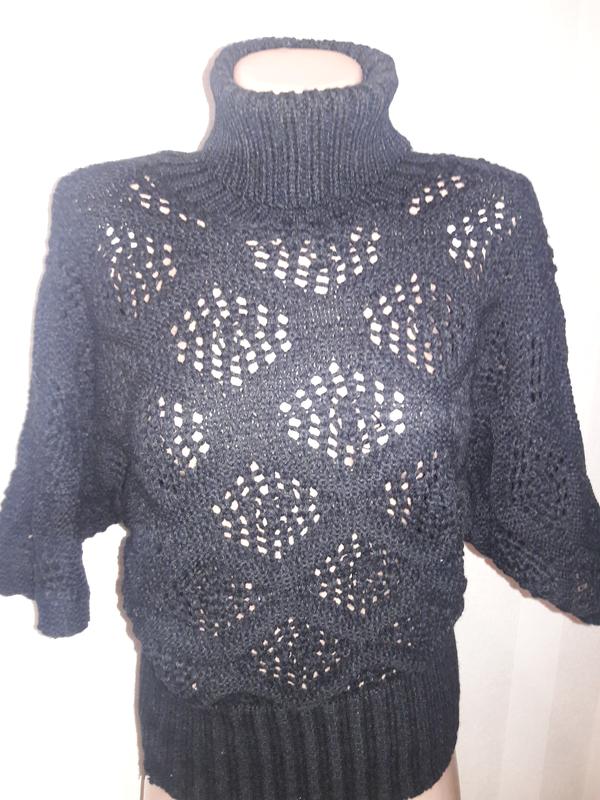 Гарна кофтинка ,чорного кольору ,горловина з коміром ,рукав три чверті (кажан)в ідеальному стані .Неколючая і тепленька.Ширина плечей 44см,довжина 57см