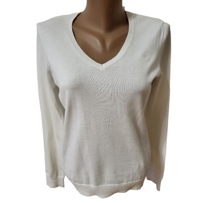 білий джемпер з v подібною горловиною, на грудях невелика вишівка, 100% бавовна, дуже м'який на дотик. ПОГ 46,5 довжина 58, добре тягнеться підійде як на S так і на М